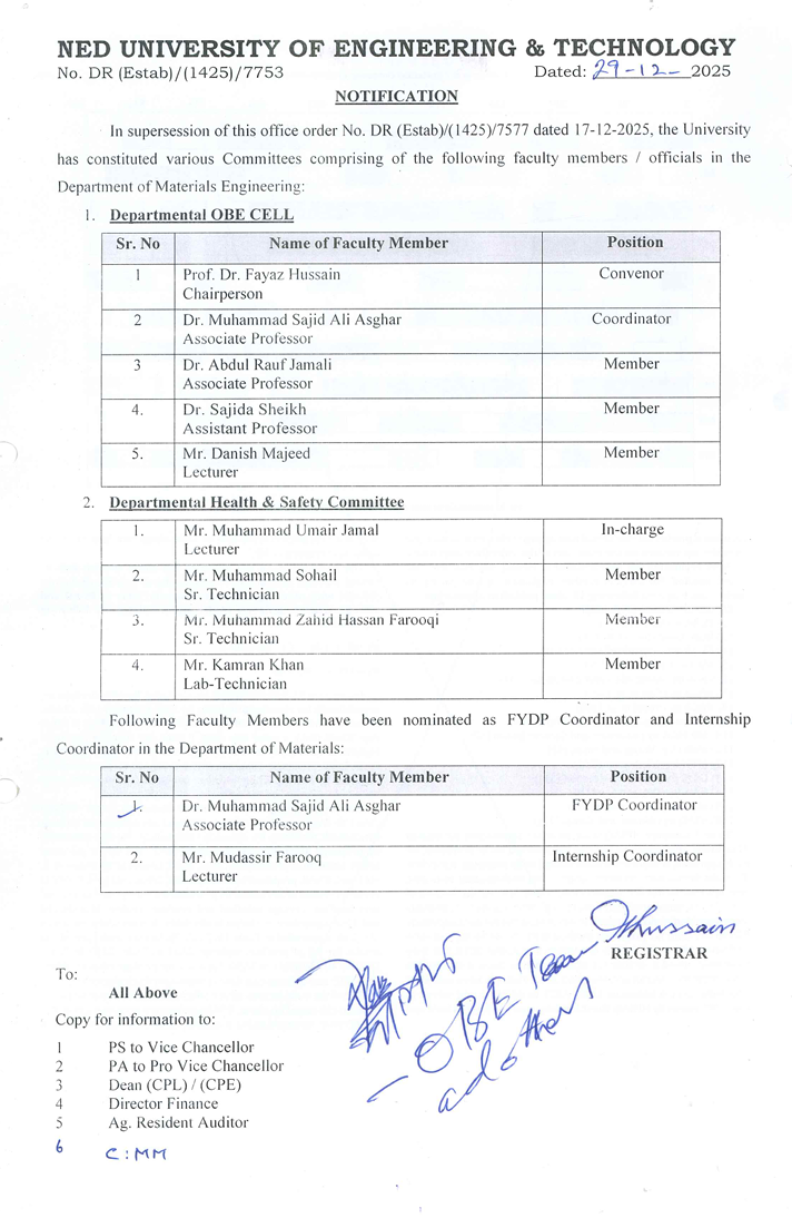 Vision and Mission of NEDUET Vision and Mission of Materials Department PEO Materials Engineering Department Mapping of PEOs to NEDUET Vision and Mission PLO of Materials Engineering Department Mapping of PLOs &CLOs Description of CLOs Course Profiles OBE TEAM OBE Poster Vision & Mission poster